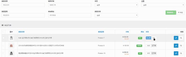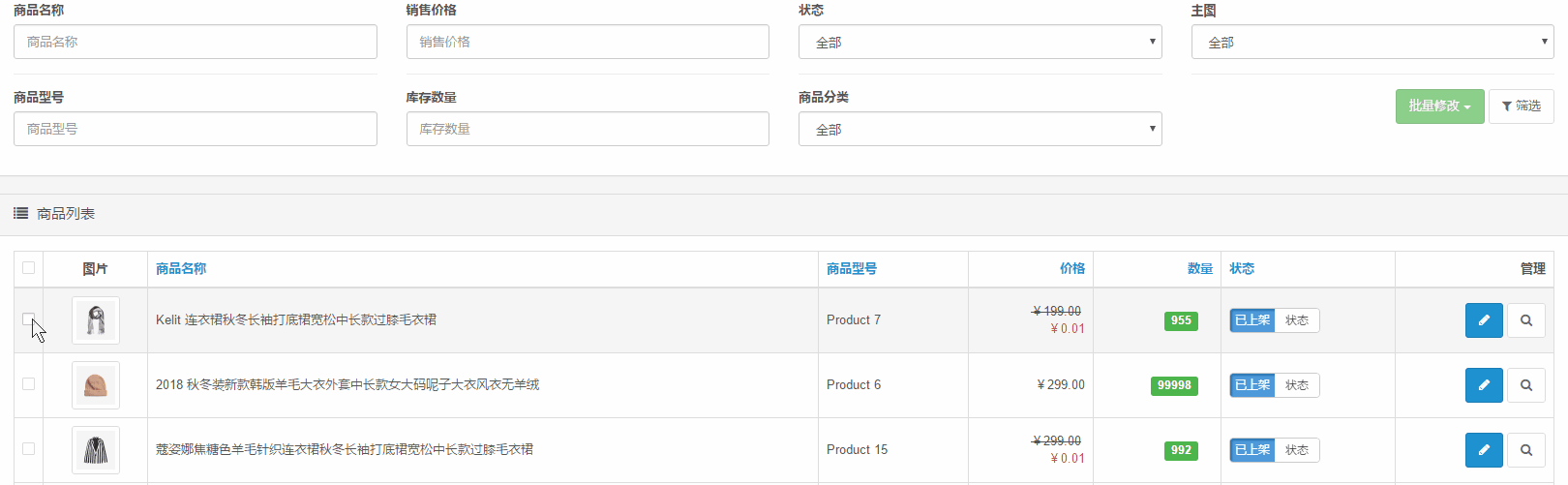 商品价格、型号、库存数量、商品状态一目了然,无需进入编辑页面即可修改。