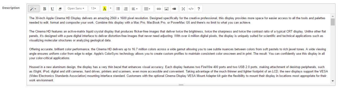 可插入图片、表格,可插入可供编辑的多媒体以及链接,让你的商品描述变得丰富起来,图文结合,配上视频的介绍,使你的商城活灵活现。