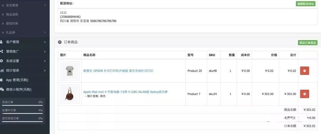 ✦ 子商品主图一个页面上传, 批量设置价格库存,自动生成不同类型商品 ✦ 子产品在最新商品,特价商品页面不显示,仅在详情页显示 ✦ 设置页面下拉选项disable ,订单状态设置(新增,修改)不可更改 ✦ 后台订单页面可快捷编辑调整订单信息,包括修改商品价格,添加商品和发货地址信 息 ✦ 推荐商品,最新商品等首页展示模块的标题名称,在后台客户可自定义