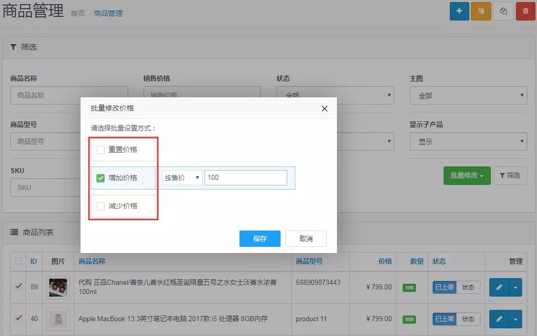 ✦ 高级筛选功能,根据价格、品牌、选项进行快速筛选,关联项可动态显示隐藏 ✦ 新增高级类型管理,对系列商品产品增加SKU,可分别精准管理相同产品不同类型的 库存 ✦ 设置页面下拉选项disable ,订单状态设置(新增,修改)不可更改
