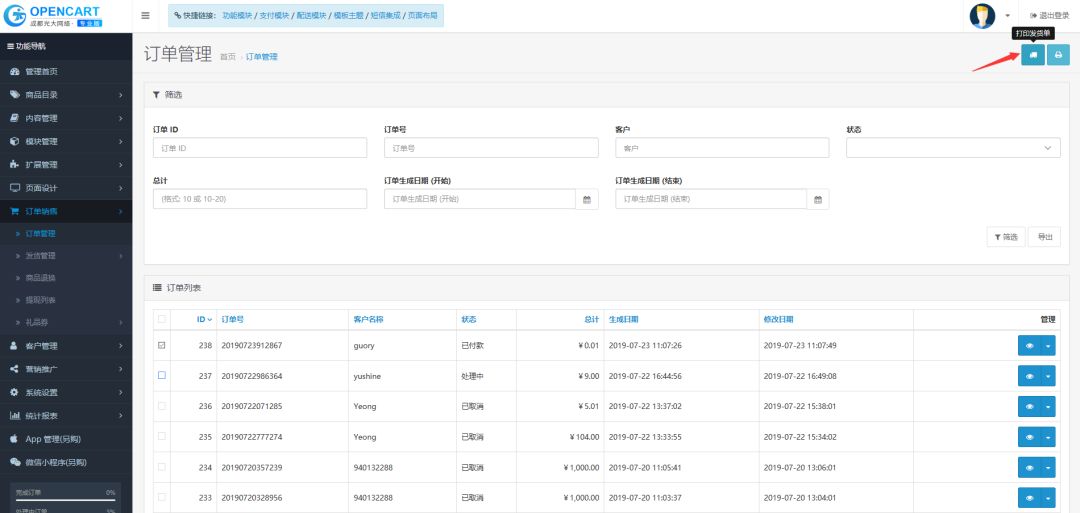 ✦ 支持发票和订货单在系统后台一键打印功能 ✦ 订单确认页面,订单列表,详情页增加显示商品图片 ✦ 订单查询——订单支持价格区间查询,订单日期支持创建订单日期区间查询